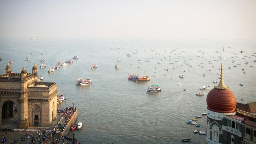 Gateway of India overlooking Mumbai harbour, with boats bobbing and crowds along the promenade /