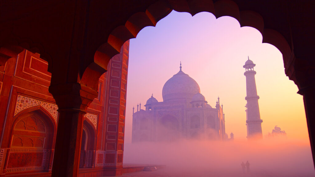 Mist curls around the Taj Mahal, Agra, love etched in marble, beauty hushed and timeless